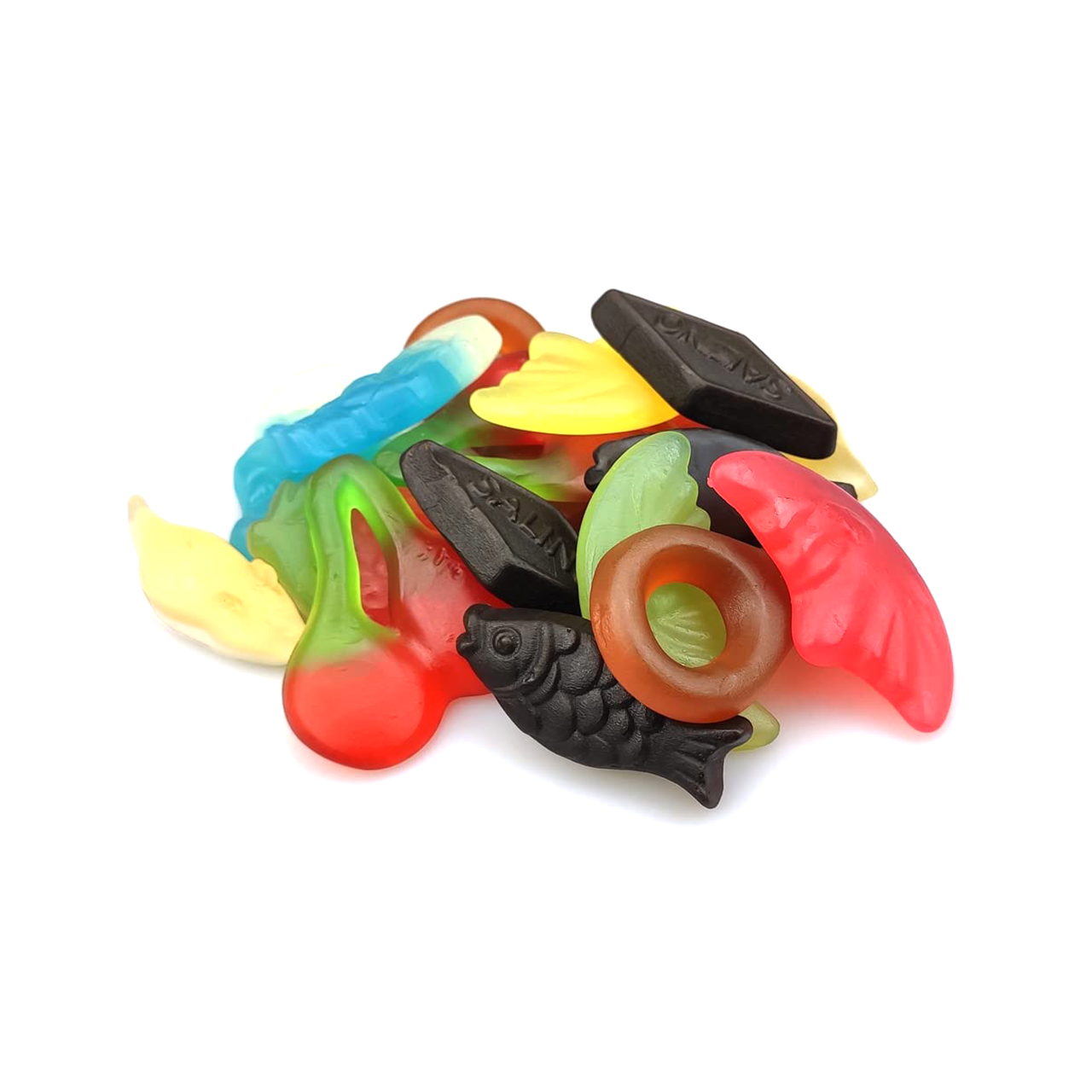 Glucose syrup, sugar, starch, braun sugar sirup, wheat flour, gelatin, dextrose, acidifier: citric acid; liquorice extract (3%in drop share), flavor, cooking salt, fruit and plant concentrates: safflower, spirulina, apple, horseradish, sweet potatoe, carrot, blackcurrant, hibiscus, elderberry, orange, chokeberry, grape, lemon; caramel syrup, glazing agents: bees wax white, beeswax yellow, carnauba wax; elderberry extract, colour: indigotine; invert sugar syrup. May contain traces of milk