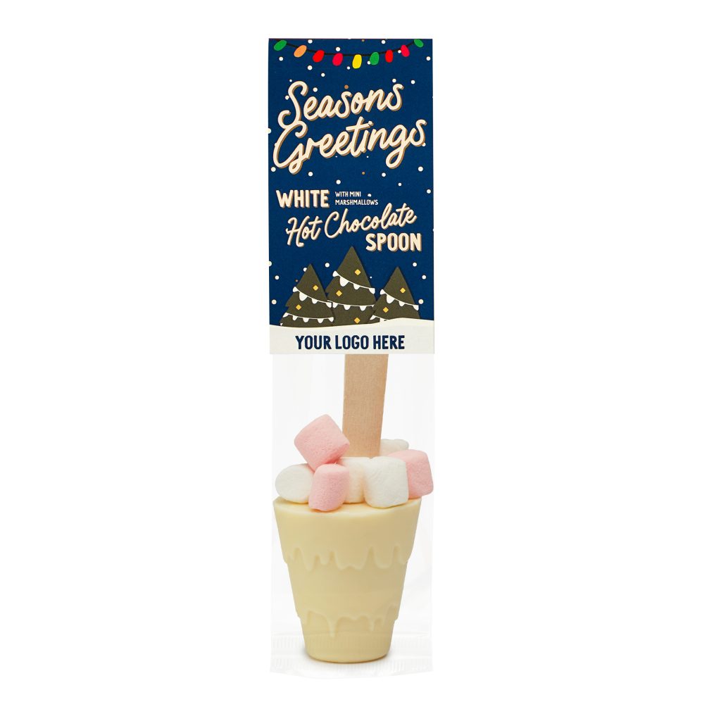 Warm up your winter campaigns with our Eco Info Card featuring a Hot Choc Spoon in creamy White Chocolate, topped with mini marshmallows.